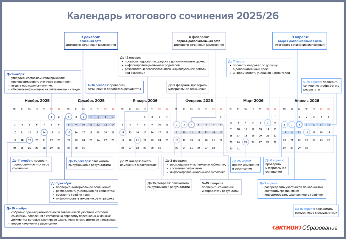 Итоговое сочинение (изложение) проводится для обучающихся XI (XII) классов, экстернов в первую среду декабря последнего года обучения по темам (текстам), сформированным по часовым поясам Рособрнадзором. Дополнительные сроки – в первую среду февраля и первую рабочую среду мая.