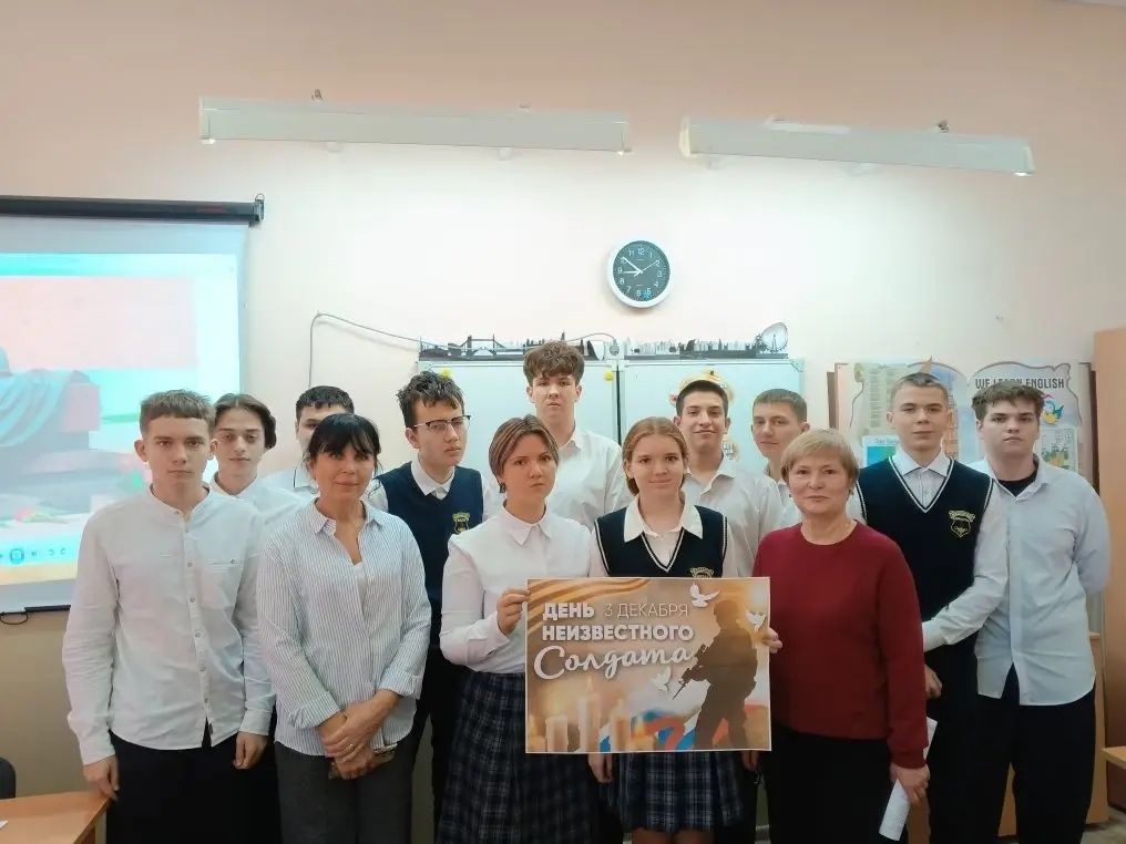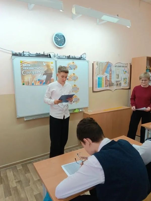 В 10 классе прошло мероприятие, посвящённое Дню Неизвестного солдата. Сотрудники библиотечного информационного центра познакомили ребят с историей появления памятной даты, обсудили значение сохранения памяти о погибших неизвестных воинах. В ходе мероприятия ученики посмотрели видеоролик, рассказывающий о памятниках Неизвестному солдату в различных городах. А в заключении послушали песню в исполнении В. Высоцкого "На Братских могилах не ставят крестов..."