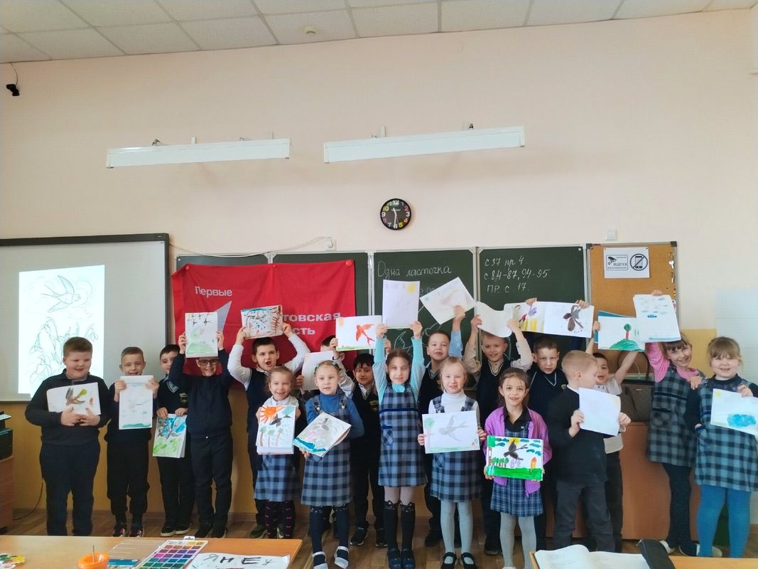 После увлекательной беседы маленькие художники с энтузиазмом принялись за дело: они учились рисовать ласточку! Ребята старательно передавали её изящные очертания — раздвоенный хвостик, острые крылышки, стремительный полёт. Каждый рисунок получился уникальным и по‑весеннему светлым!